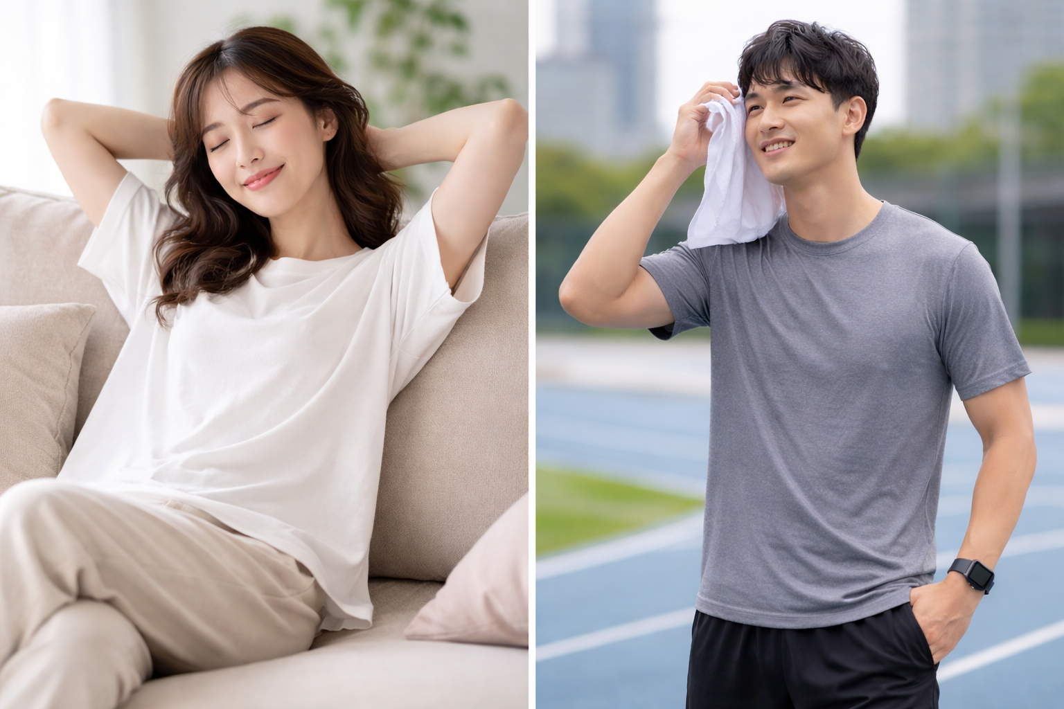 同じ「やわらかいTシャツ」でも、これらはすべて違う手触りです。たとえば、リラックスしたい日に選びたくなるのは、包み込まれるようなふんわり感のあるTシャツでしょう。一方で、暑い季節や汗をかきやすい場面では、さらっとした手触りの方が快適に感じられます。